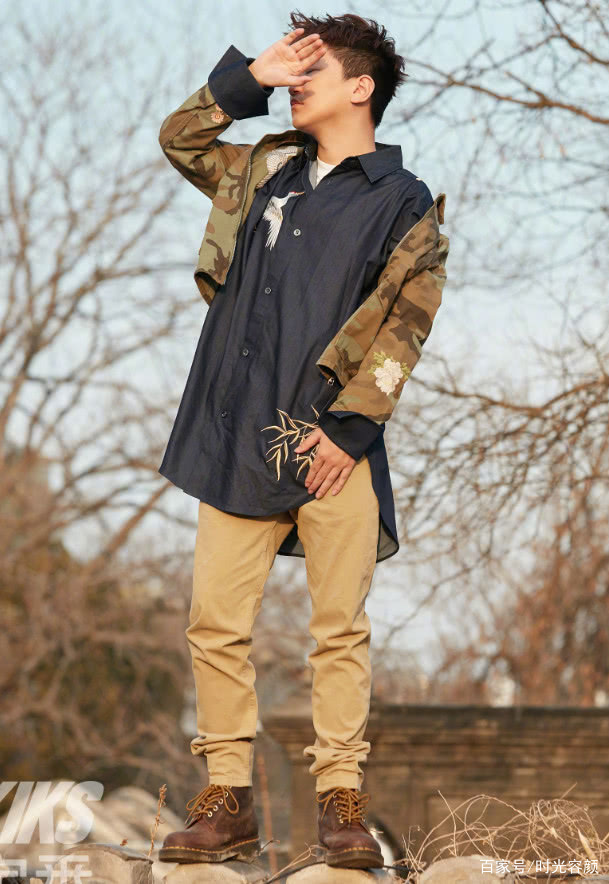 為何張大大這么喜歡土色系,他這身造型又是以土色為主,褲子與靴子都是土色系。他穿了一件黑色的長款襯衫,襯衫的右側還繡了一只充滿了仙氣的白鳥,他外搭一件迷彩風外套,有點混搭的感覺,看來他對駕馭這種型男風還蠻有心得的呢。